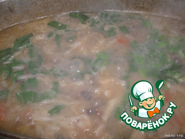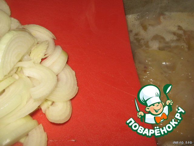 Когда картофель сварится до полуготовности, добавляем лук, полукольцами.