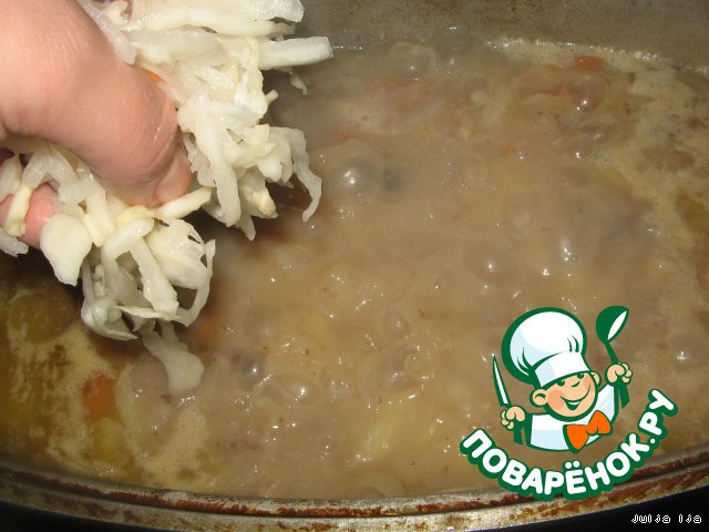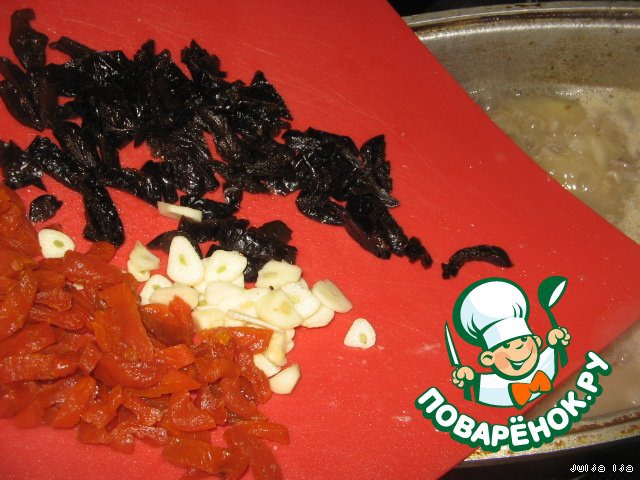 Когда картофель будет почти готов, добавляем, предварительно промытые, нарезанные курагу, чернослив и чеснок.