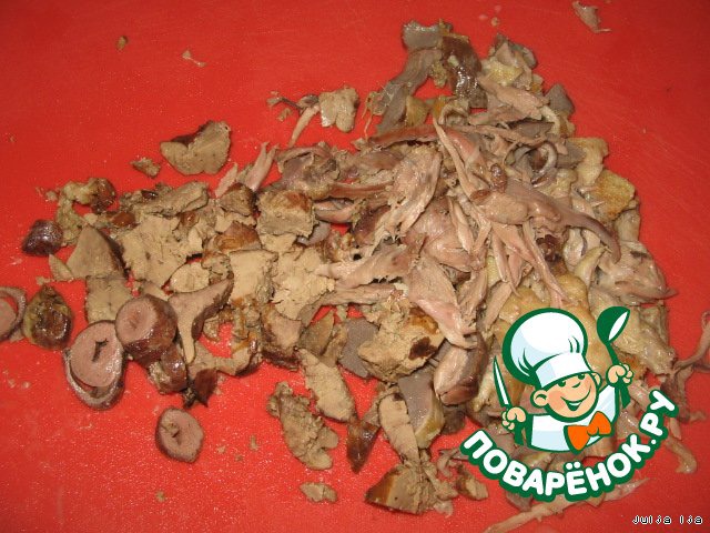 Потрошки тем временем остужаем, а потом отделяем мясо от косточек, печень, сердце и желудок нарезаем.