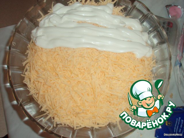 Дальше слой сыра, тертого на мелкой терке+майонез.