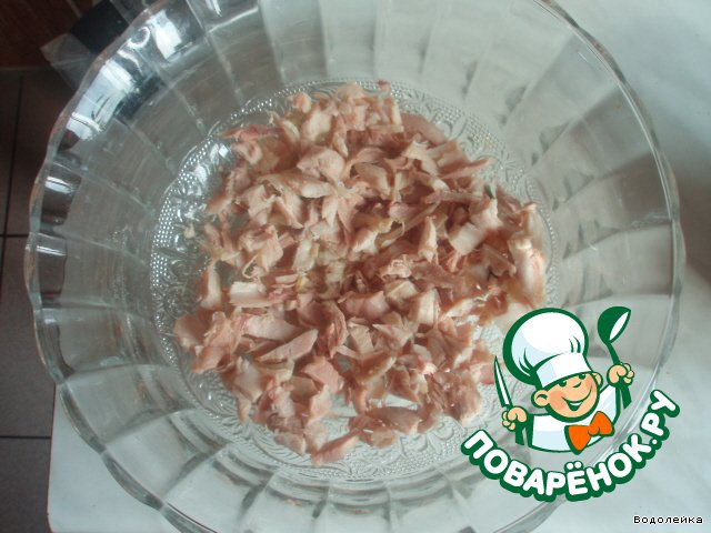 Куриное мясо отварить, остудить, нарезать и выложить в салатник.