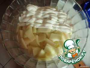 Следующий слой: яблоко, его почистить и нарезать кубиками + майонез. У меня яблоко нарезано пластинками, мне не очень понравилось, лучше будет кубиками.