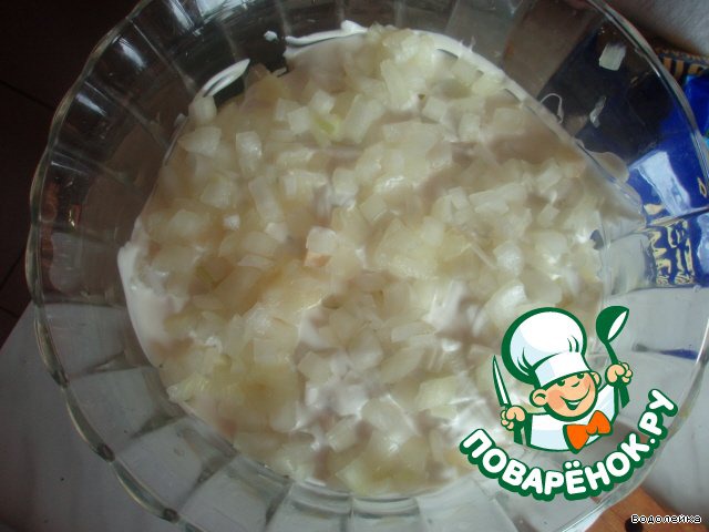 Дальше слой лука. Лук предварительно промариновать, либо залить кипятком. Неважно, что вы сделаете, главное, чтоб не было горечи