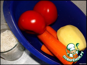 Итак, рассказываю. Морковь натерла на "корейской" терке. Картошку и помидоры кубиками, масла побольше и потушила овощи минут 15. Ну соответственно варила минут 10. Вместо риса добавила подрумяненную на сухой сковородке гречневую и ржаную муку. (Муж рис в супе не любит)