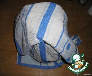 Здесь у меня самый разгар процесса. Банка обёрнута электрогрелкой и всё это дело укутано полотенцем. Температура грелки стоит на минимуме - это примерно 35°С - идеальная температура!