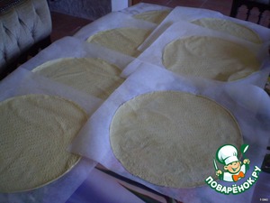 У меня получилось семь коржей. Сделала их все сразу на отдельных листочках бумаги. Выпекать очень удобно: один достал вместе с бумагой, следующий в духовку. Бумагу использую несколько раз.