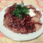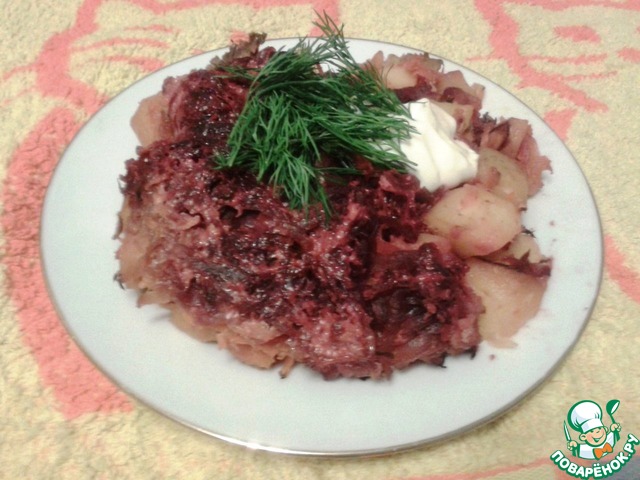 Лук очистить и нарезать средними кольцами, свеклу и морковь натереть на крупной терке в разную посуду. Картофель нарезать кубиками.