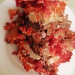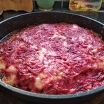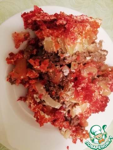 Сковороду смазать растительным маслом и первым слоем уложить фарш, посолить и добавить специй. В этот раз я использовала отбитое филе индейки, порезанное мелкими кусочками. Но лучше использовать свино-говяжий фарш - с ним получается вкуснее, хотя - на любителя :)))