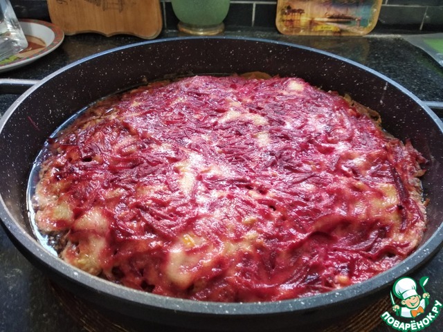 Поверхность выровнять. Накрыть сковороду фольгой или крышкой. Запекать в нагретой до 200 градусов духовке 1 час. Через час крышку или фольгу убрать и запекать еще 10 минут до румяной корочки. Готовое блюдо посыпьте зеленью...