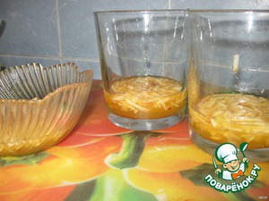 Добавляем часть желатина (на глаз) так, чтобы на вторую часть немного больше осталось. Разливаем в формочки и оставляем застывать.