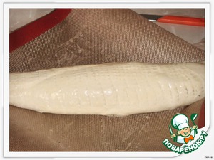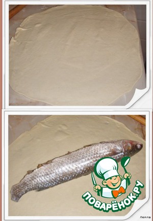 Расскатать тесто, выложить рыбу и свернуть тесто по форме рыбы