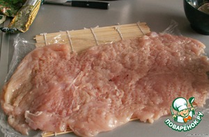 Куриное филе отбить. Выложить на пленку внахлест. Очень пригодился коврик для суши.