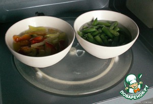 В замороженный перец и фасоль добавила воды и поставила в СВЧ на максимум, на 5 минут. Можно просто перец нарезать, обжарить на сковороде до мягкости, фасоль отварить.