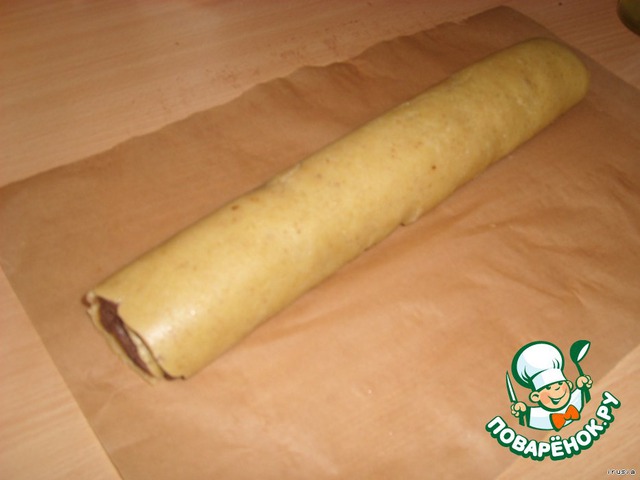 Аккуратно переносим один пласт на другой. Разрезаем пополам и скатываем каждый в рулетики.Снова убираем в холодильник на 30 минут, я клала на 10 минут в морозильную камеру.