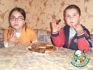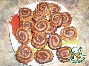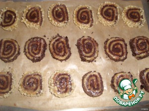 Достаём рулетики после охлаждения и нарезаем вдоль примерно 1 см. толщиной. Каждый смазываем белком и обваливаем половину печенюшек в орехах, а половину в шоколаде (только по краю, серединка остаётся нетронутой). Выкладываем на противень, застеленный пекарской бумагой. Выпекаем при температуре около 200° 10-12 минут.