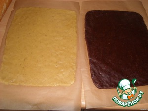 Достаём тесто из холодильника и раскатываем каждое в квадратные пласты примерно 0,5 см. толщиной. Оба пласта щедро смазываем белком.