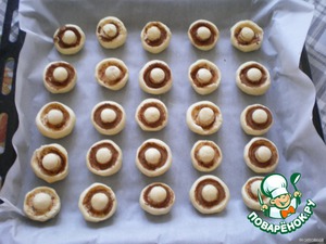 Противень выстилаем бумагой для выпечки и укладываем на него "грибки", по мере их формирования, на некотором расстоянии друг от друга. -
