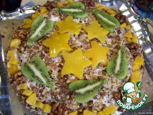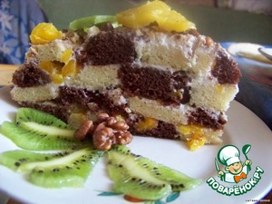 Шоколадный аналогично. теперь собираем, чередуя шоколадные и белые круги. каждый слой промазываем кремом, орехами и кусочками персиков. следующий корж - на место белого круга шоколадный.