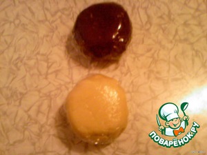 Разделить тесто пополам. Одну половину хорошо вымешать, чтобы тесто не прилипало к рукам. Во вторую половину добавить какао и тоже хорошо вымешать.