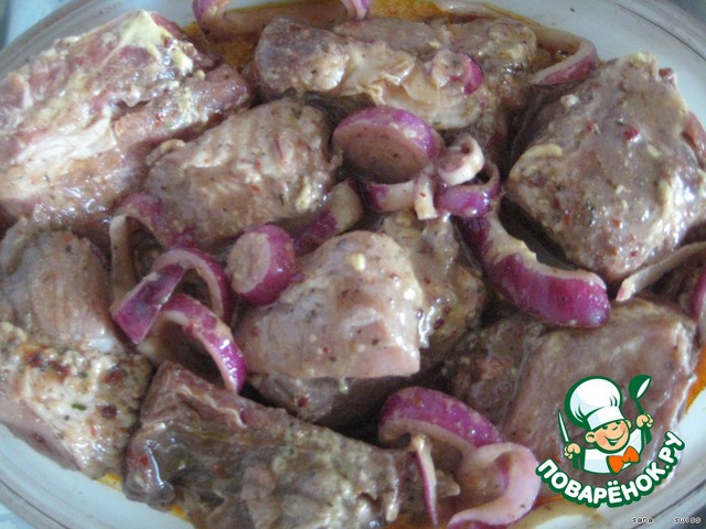 Из горчицы, оливкового масла, гранатового концентрата, вина, соли, перца и "хмели-сунели" сделать маринад.