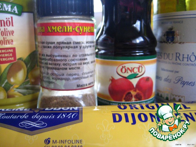 • Из горчицы, оливкового масла, гранатового концентрата, вина, соли, перца и "хмели-сунели" сделать маринад.