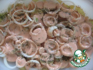 В огнеупорное блюдо, слегка смазанное, выложить картофель, нарезанный кружочками, сверху - кольца маринованного лука, посыпать слегка мускатным орехом и залить сливками, смешанными с кетчупом.