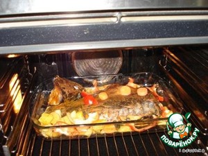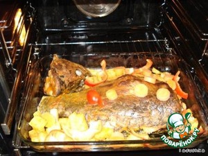 И вот, наконец-то, наш карп, пропитанный ароматом овощей и с хрустящей корочкой готов, можно доставать форму из духовки,