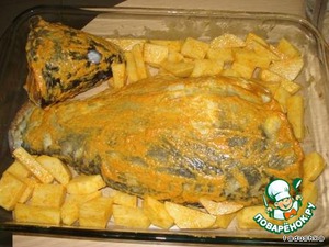 Пропитавшуюся рыбу укладываем в жаропрочную форму или противень, смазанный растительным маслом, у меня жаропрочная стеклянная форма. Промазываем картофель оставшейся смесью, морковь, лук и перец закладываем внутрь рыбы, а картофель раскладываем вокруг и поверх нее. -
