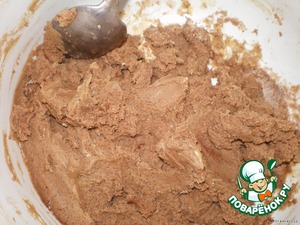 Затем в эту смесь постепенно вводим содержимое первой миски (т. е. муку со всеми ингредиентами) и какао-порошок.