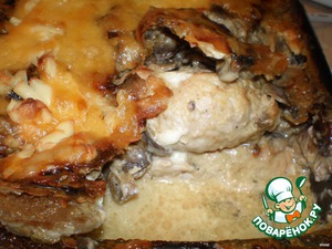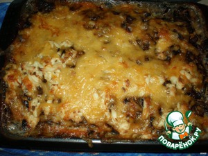 залить шампиньоновую заливку сверху, если она слижком густая, разбавить ее молочком. поставить в духовку, готовить мин 30-40 при 180-200 градусах