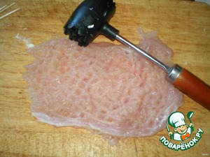филе индейки нарезать тонкими пластами, каждый отбить как можно тоньше