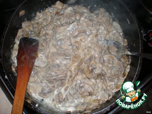 добавить на скровороду шампиньоны, обжарить до готовности мин 10-15, приправить солью и перцем, добавить майонез или сметану, отставить.