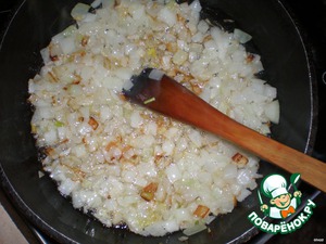 нарезать мелко репчатый лук, обжарить на растительном масле до золотистого цвета