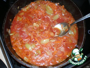 Все ингрeдиенты сложить в кастрюлю, залить томатным соусом,