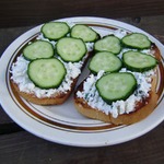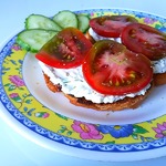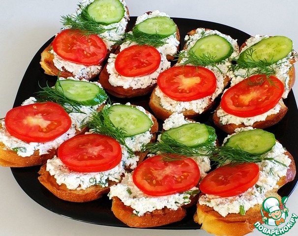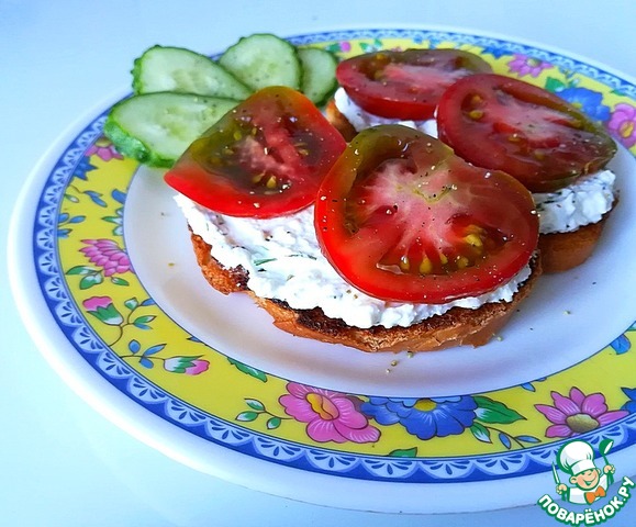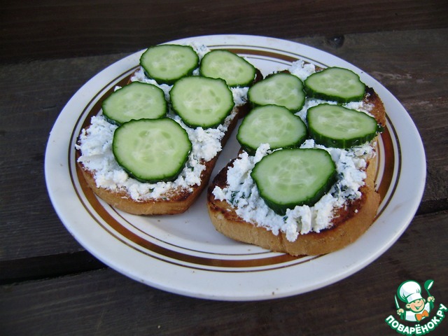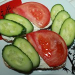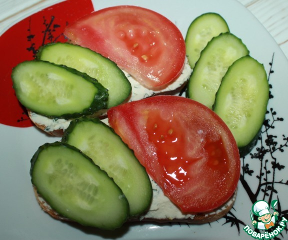 Намазать на готовый тост, уложить дольки помидора и огурчика.