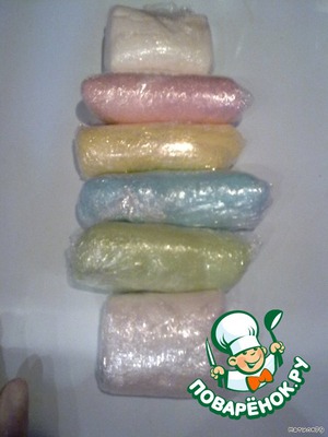 Ну, вот такие колбаски маcтики получились. Их нужно запаковать в пленку и убрать в холодильник. Неделю пролежат смело. Когда надо будет из нее что-то сообразить, просто достаете, берете кусочек сливочного масла, и превращаете этот кусочек в "пластилин"