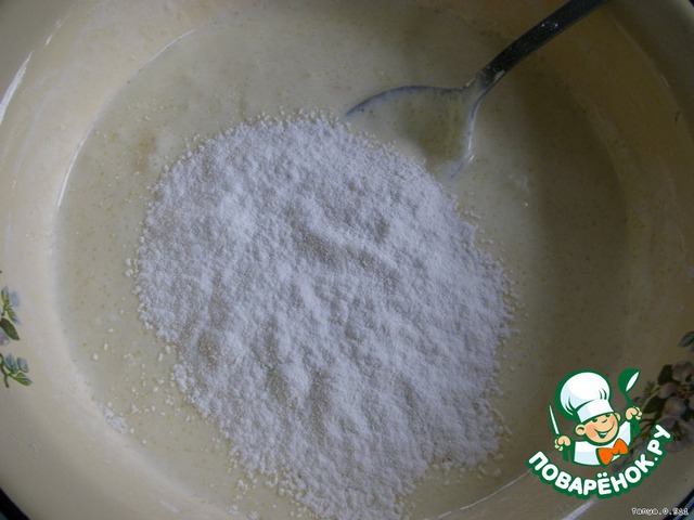 Добавить 1 яйцо, 2-3 ст. л. сахара, щепотку соли, 0.5 ч. л. соды (погашенной) и 2 с горкой ст. л. крахмала.