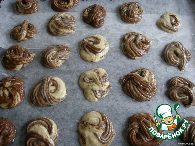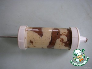 В кондитерский шприц выложить поочередно темное и светлое тесто.