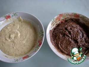 В одну добавить 1 ст. л. какао, в другую - 1 ст. л. мелко толченных орехов и 1 п. ванильного сахара. -