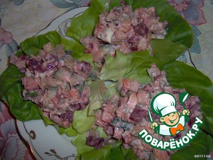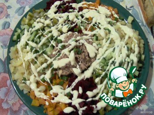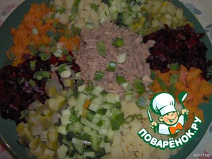 Этот салат из овощей и лосося (консервы в собственном соку). Но можно и тунец в собственном соку, у меня в данный момент тунец. Но настоящий салат нужно делать из лосося. Этот рецепт я узнала ещe в 15 лет, и он стал нашим коронным салатом на всех праздниках. И только я его готовила дома... :)