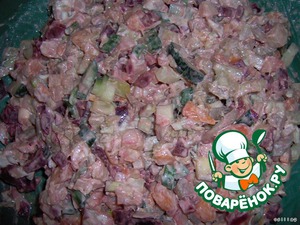 свежий огурец, маринованный огурчик, зелёный лук, соль, консерва лосося или тунца, майонез.