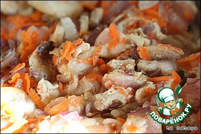 После того как лук приобрел золотистую корочку, высыпаем в сковородку тертую морковь, курицу и грибы.