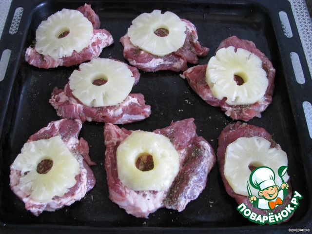 На каждый кусочек положить кружок ананаса и поставить в разогретую духовку (200*С) на 25 минут