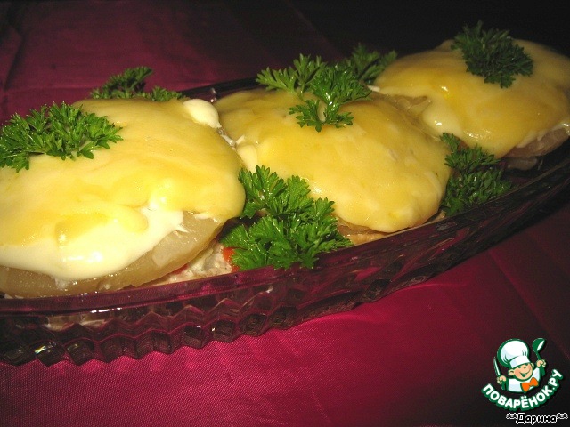 Противень вытащить, уложить по пластинке сыра на каждую порцию и поставить в духовой шкаф еще на 5 минут.