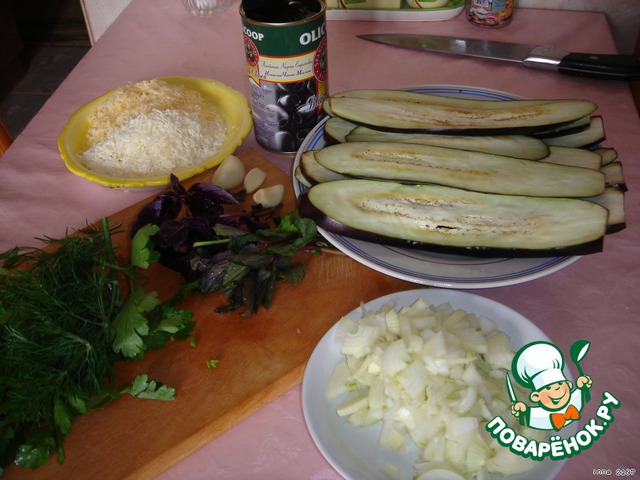 Ингредиенты для «Рулетики из баклажанов c сыром и оливками»: