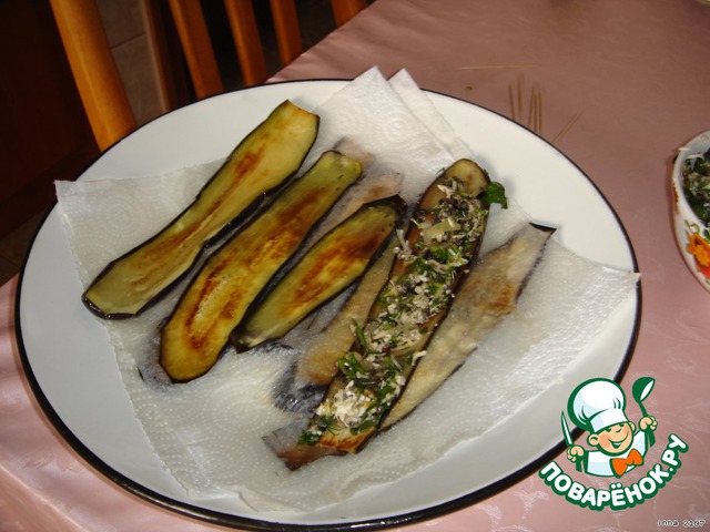 Положить обжаренные баклажаны на салфетки бумажные (чтобы убрать лишний жир).