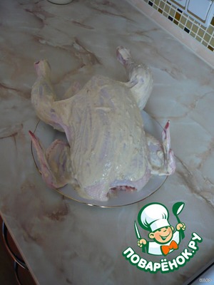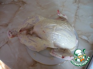 Натираем тушку курицы маринадом и оставляем мариноваться на 45 мин.