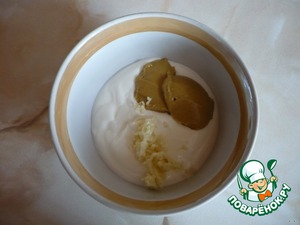 Готовим маринад: смешиваем 4-5 ст. л. сметаны, 2 ст. л. горчицы, 2 зубчика чеснока, соль и специи (тут по вкусу, у меня была полюбившаяся мне сванская соль).
