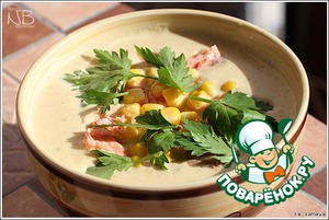 Разливаем по тарелкам, добавив кусочки рыбы, кукурузу и украшаем веточками зелени.