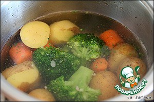 Бульон из-под рыбы можно процедить и отваривать овощи в нем. Но можно и налить новую воду. В ней отвариваем картофель, морковь и брокколи.